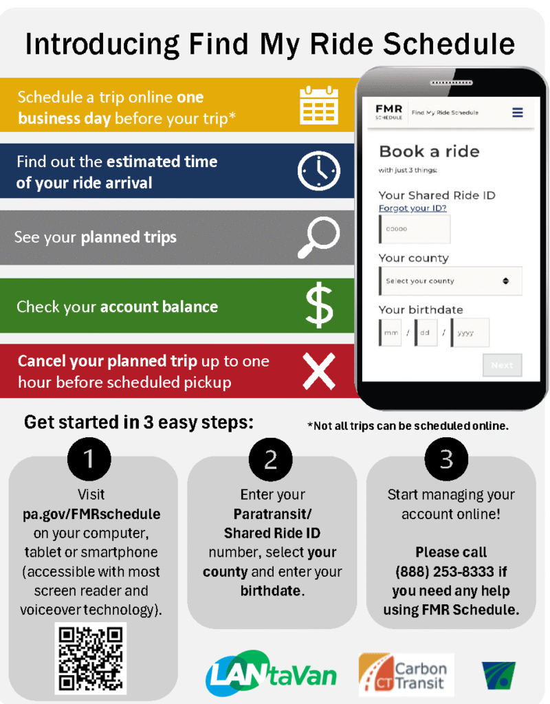 Riders now have the ability to schedule and cancel their own trips! Visit pa.gov/FMRschedule, then enter your Paratransit/Shared Ride ID number, county, and birthdate to start managing your account online.